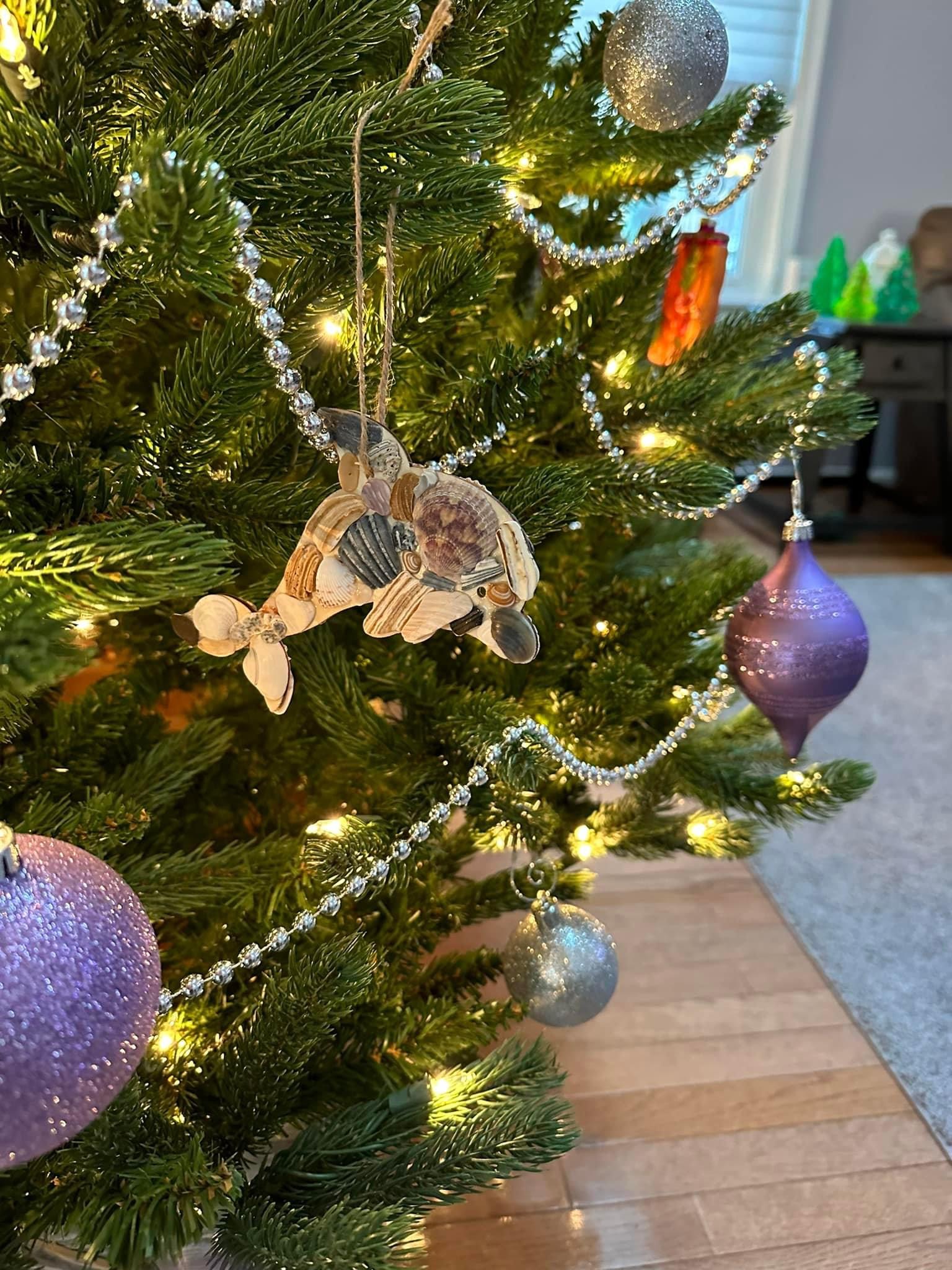 This beautiful handcrafted dolphin sea shell ornament is a unique piece of art from the Outer Banks (OBX). Each ornament is meticulously crafted with local shells making it a perfect addition to your home decor or a thoughtful gift for ocean lovers.